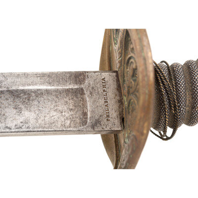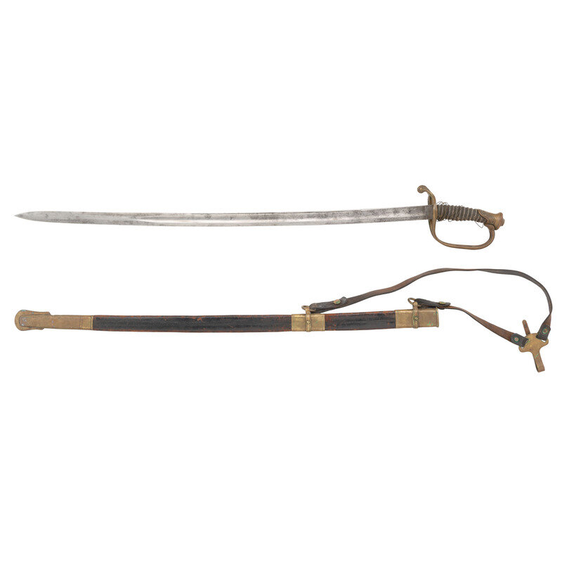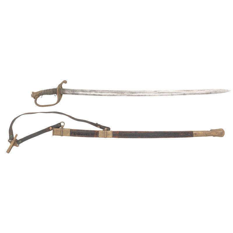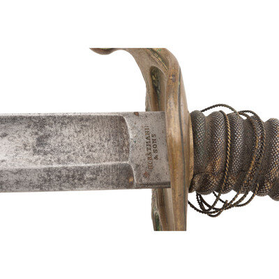 31.5" single edged spear point blade with a 21.5" stopped median fuller. Blade width at ricasso is 1.1". Overall length 37.25". 5.5" hilt with cast brass guard with foliate decoration in face and plain knuckle bow. Cord wrapped wood grip with shagreen covering and twisted wire which is loose but partly present. Reverse ricasso stamped HORSTMANN/& SONS in two lines with the obverse stamped PHILADELPHIA. Blade with traces of etched foliate and martial themes. Sword is accompanied by a brass mounted leather scabbard with a rear seam and a set of Stuart sword hangers.