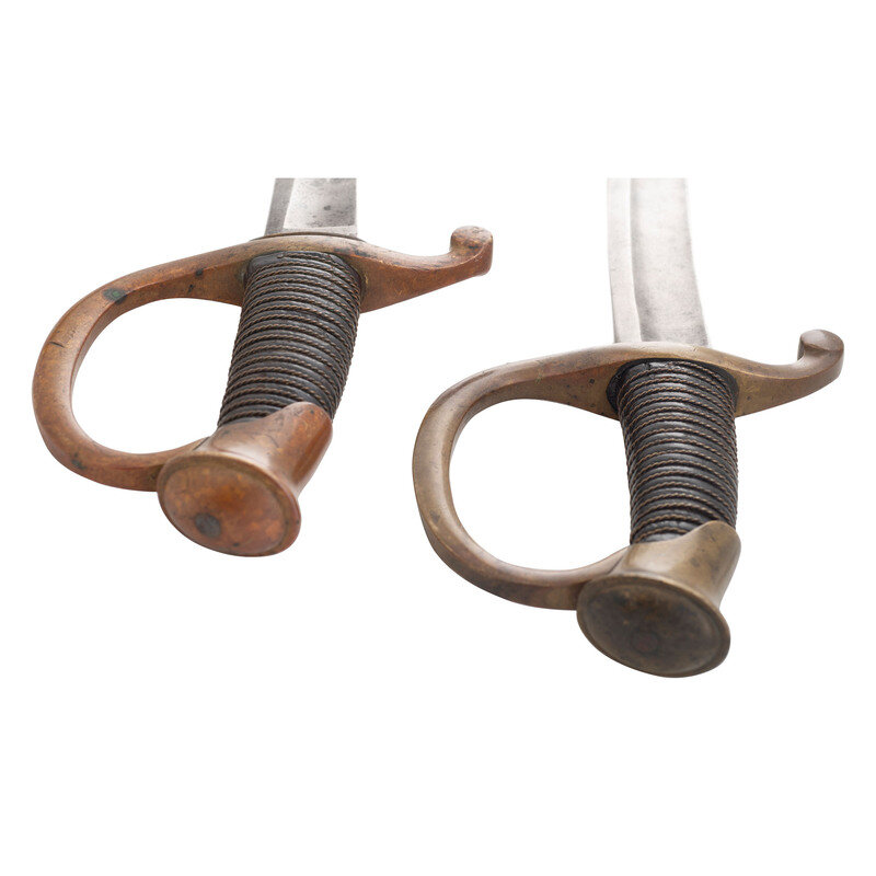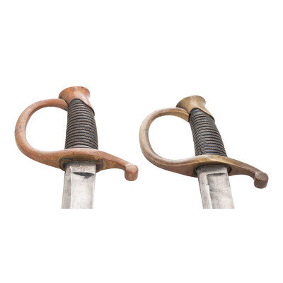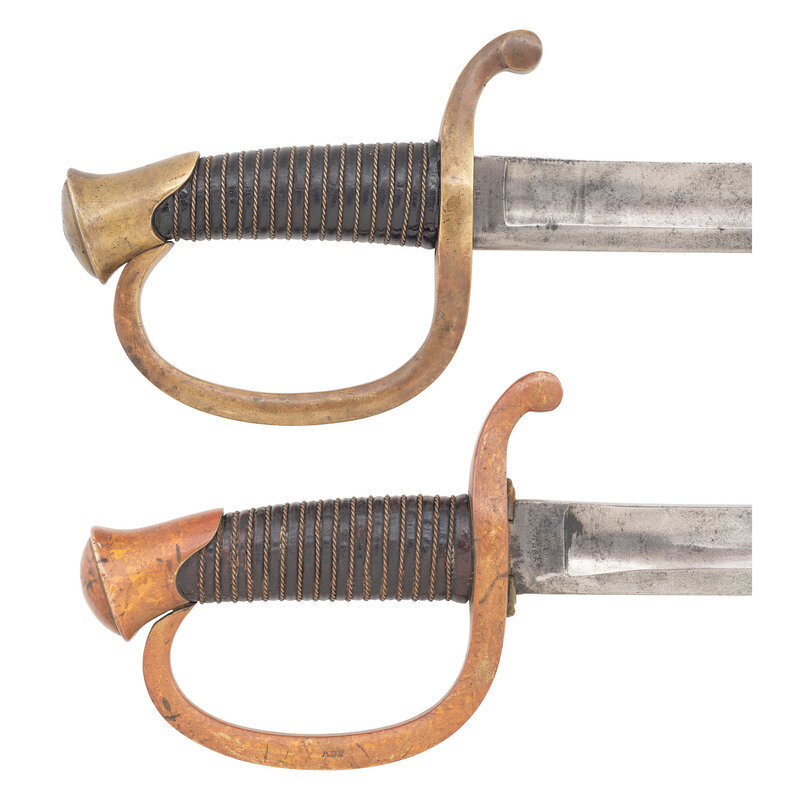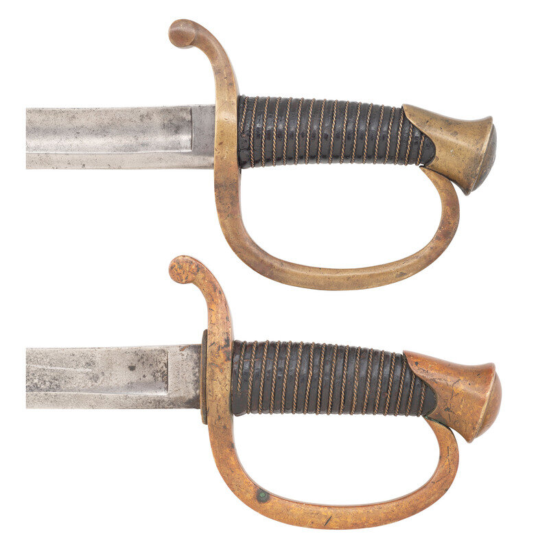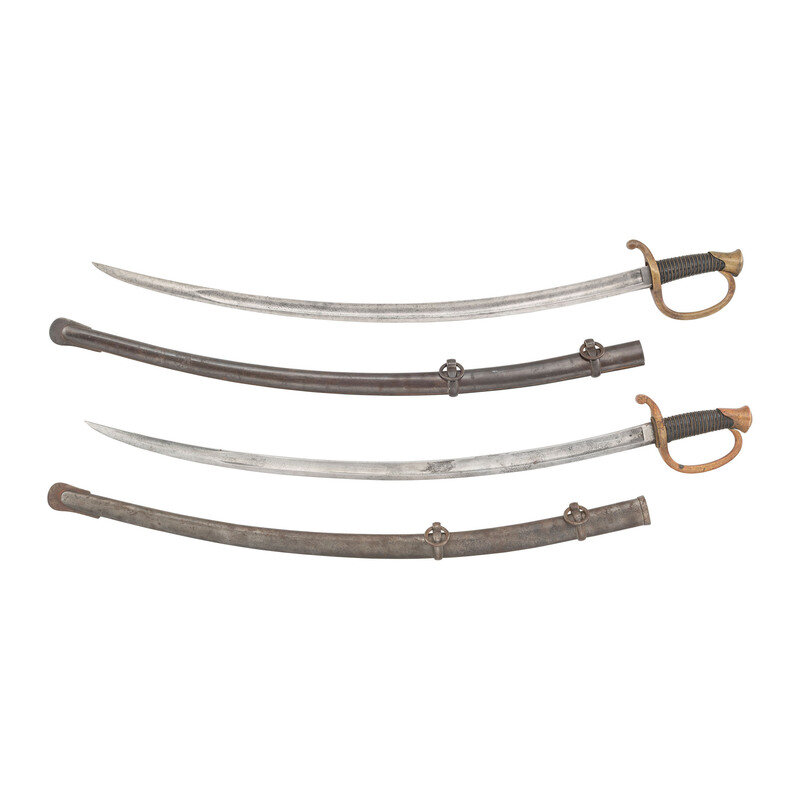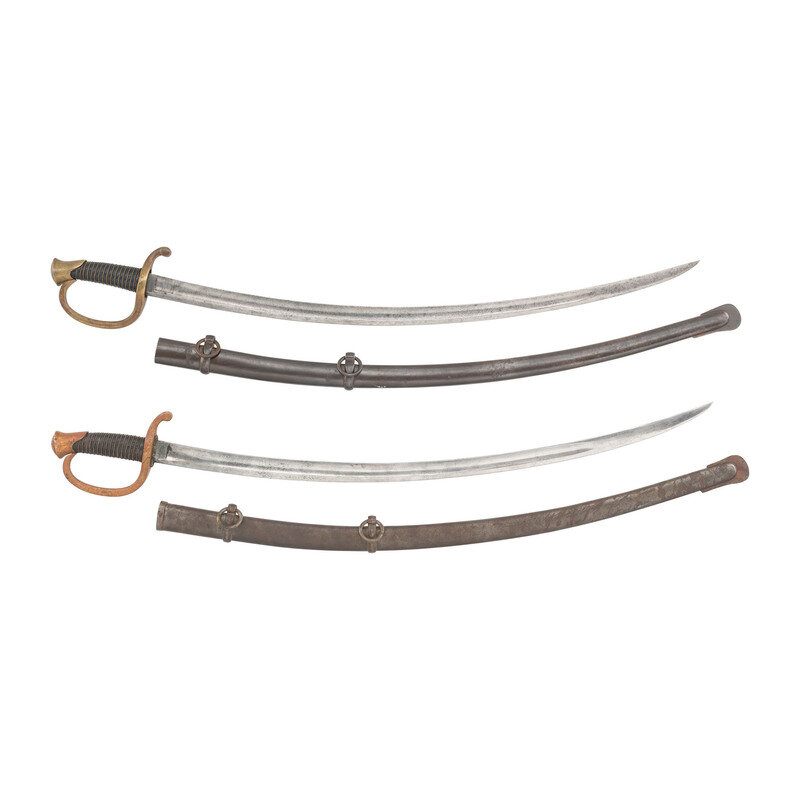 2) Unmarked Model 1840 Light Artillery Saber of the 1st production type with recessed guard face and no scabbard throat. 32" curved, single edged blade with 25" stopped median fuller. Blade 1.25" wide at ricasso. 37.125" overall length with 5.5" hilt. Brass guard with knuckle bow, forward swept disc quillon and oval brass pommel cap. Hilt with wood grip covered in leather and with 17 wraps of twisted wire. Blade marked unmarked other than the date 1860 on the reverse ricasso. Saber is accompanied by the correct pattern iron scabbard with dual iron suspension rings without a throat and without inspection marks.