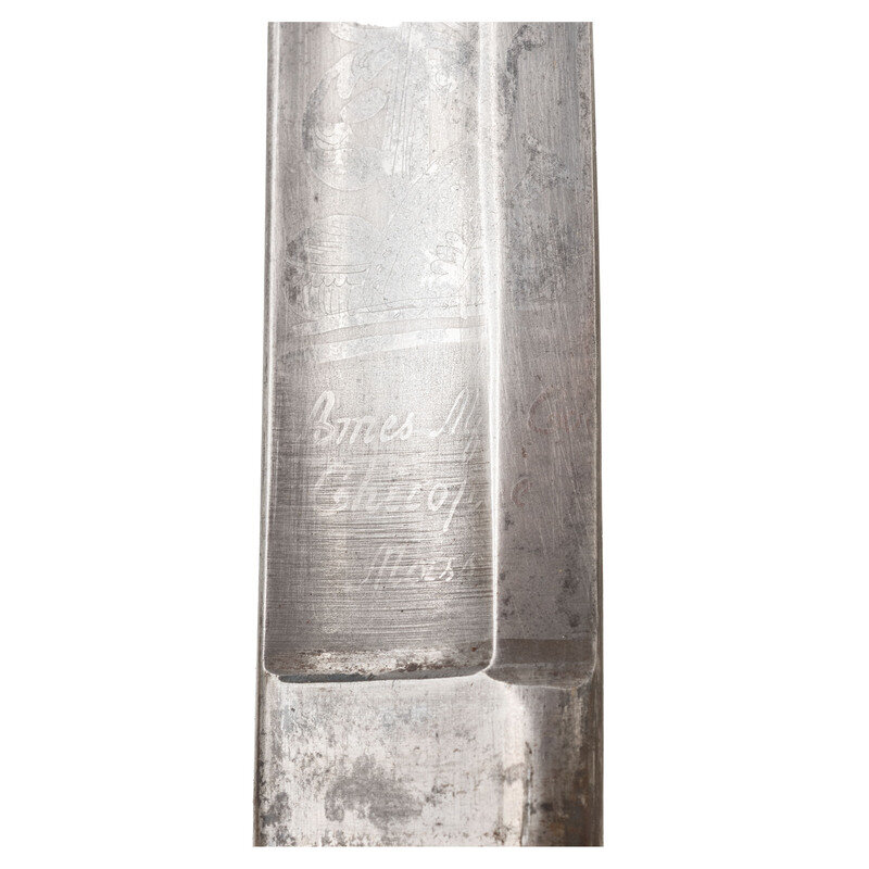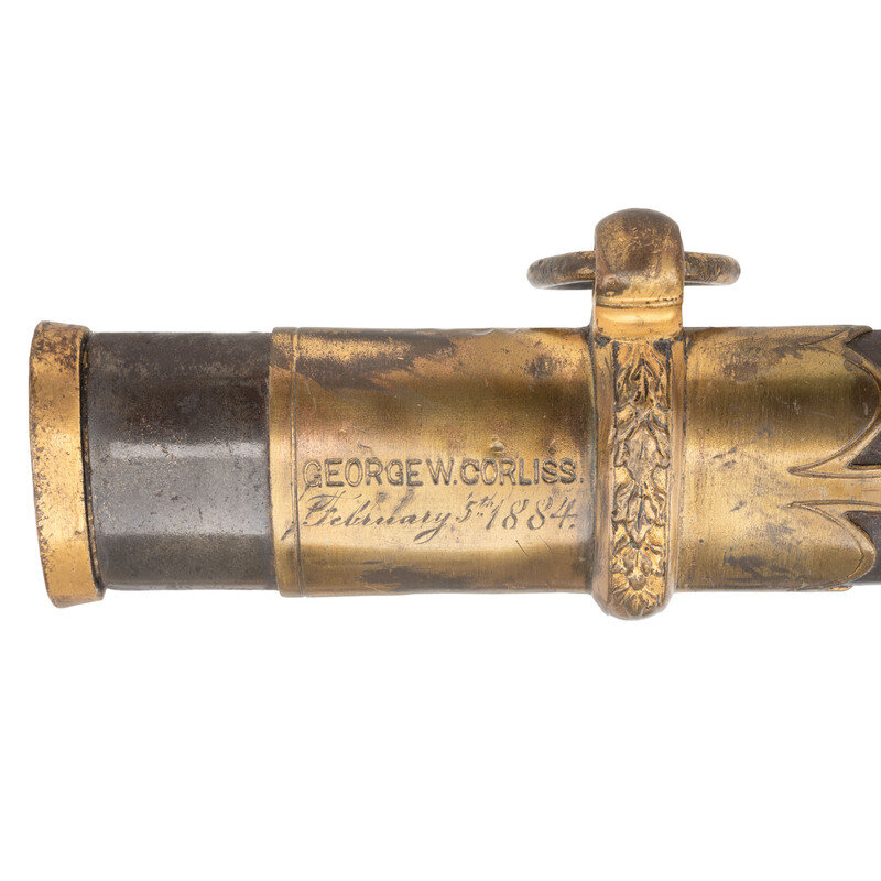 30.25" single edged blade with 20.75" stopped median fuller. Blade 1.1" wide at ricasso. Overall length 36.25" in overall length. 6" hilt with gilt brass guard with foliate patterns in face and a knuckle bow. Etched blade with foliate patterns, martial and patriotic motifs. Three line Ames mark etched on the obverse ricasso. Grooved wooden grip with shagreen covering and thirteen wraps of twisted wire. The sword is accompanied by a gilt brass mounted browned steel scabbard that is not Ames marked. Upper suspension mount is marked in two lines GEORGE W CORLISS/February 5th 1884, with the name stamped and date engraved in script. The meaning of the date is not known, but it may be related to his joining the GAR or some other organization in the post-Civil War period. The scabbard and sword may be mated, as the scabbard is about 2.5" longer than the blade.