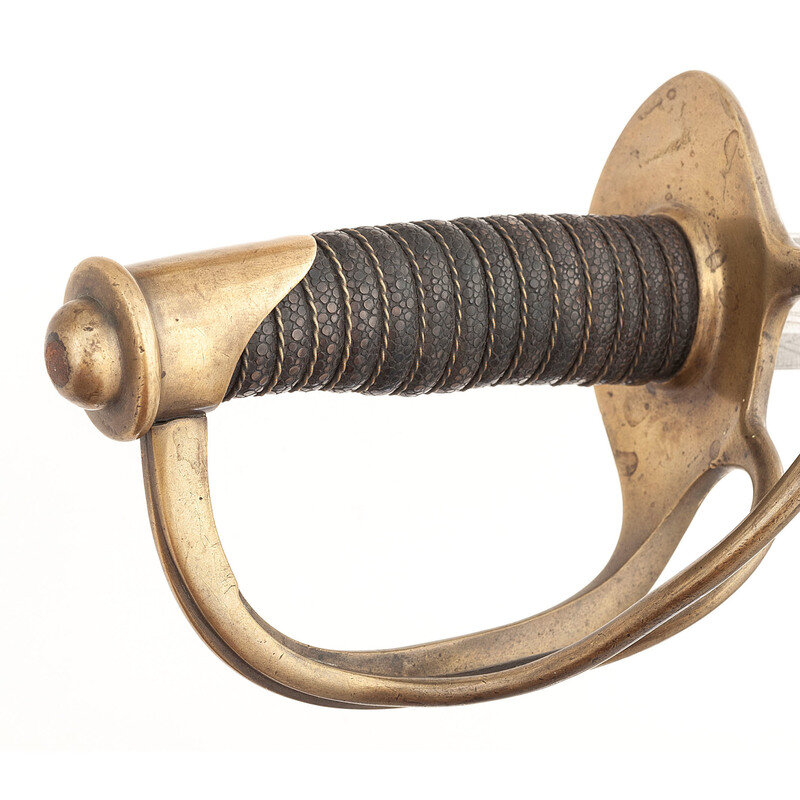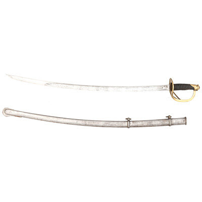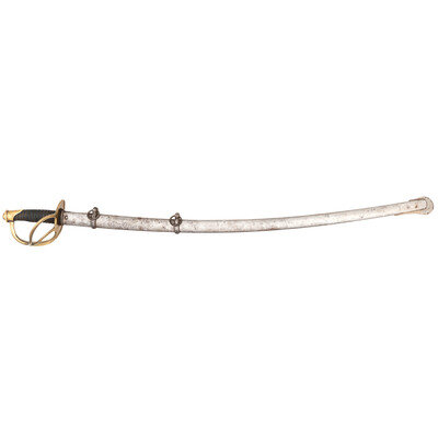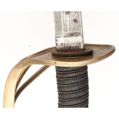 32.5" single-edged blade with 24.25" median fuller, 1.125" wide at ricasso. Blade 1.15" wide at the ricasso. 38.75" in overall length. 6" hilt with plain cast brass two-branch guard with knuckle bow and Phrygian helmet pommel cap. Guard with simple lip on face. Grooved wooden grip covered in shagreen with 13 wraps of twisted wire. Blade etched with liberty cap in sunburst, floral themes, and crossed U.S. flags with the motto STAND BY THE UNION. Obverse ricasso, marked P.S. JUSTICE/PHILADA. Iron mounted steel scabbard with iron throat secured by a domed slotted screw and with two suspension rings. Scabbard appears to be from an earlier contract Justice enlisted cavalry saber and is about 4" longer than the blade. Plain hilted cavalry officer's sabers with etched blades are not unknown, although Justice cavalry officer sabers are quite scarce in and of themselves.