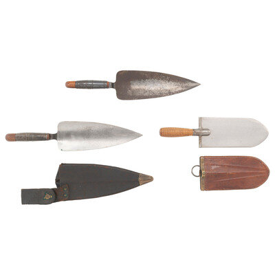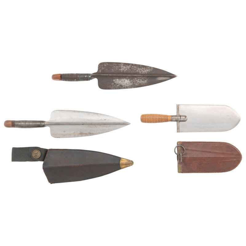 1) US Model 1873 Trowel Bayonet with Scabbard. 10" bright spade shaped blade with prominent median ridge on rear, 3.5" blued socket. Standard patent marking on socket. Bayonet includes a reproduction wood handle for use as a trowel or spade. The bayonet is accompanied by its leather scabbard with Hoffmann style swivel belt frog with a US roundel.