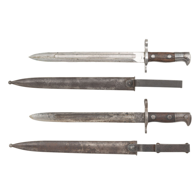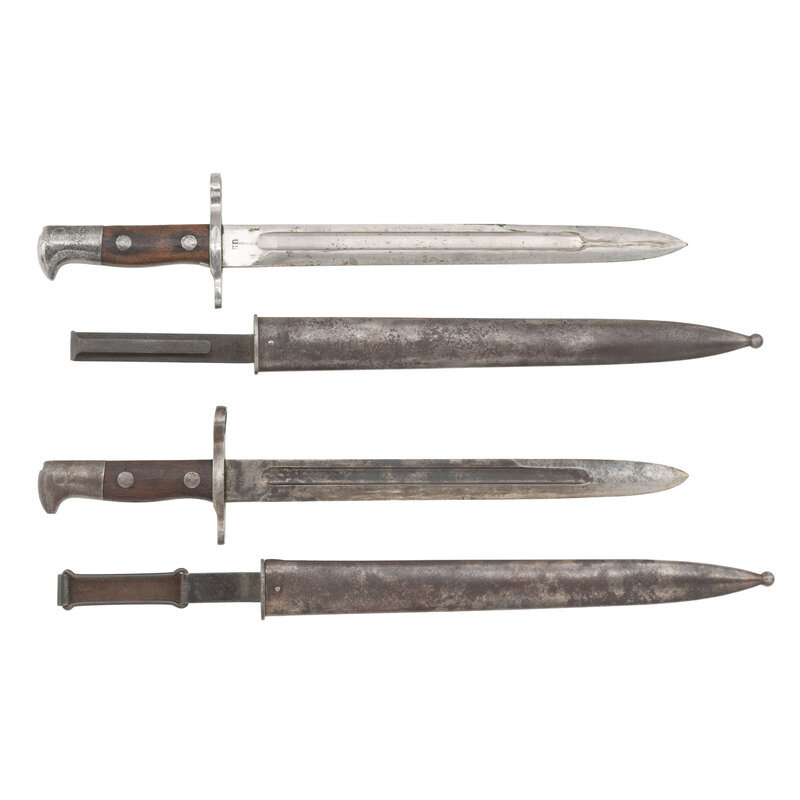 2) US Model 1892 Krag Bayonet & Type II Scabbard. 11.5" bright blade is dated 1894 on the reverse ricasso and marked US on the obverse. 16" in overall length with two piece smooth wood grips secured with two smooth, seamless rivets. Includes Type II scabbard with the rational stop pins to prevent 360-degree rotation and the wide wire belt keeper to go over a cartridge in a cartridge belt loop.