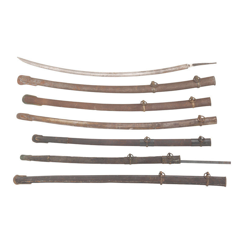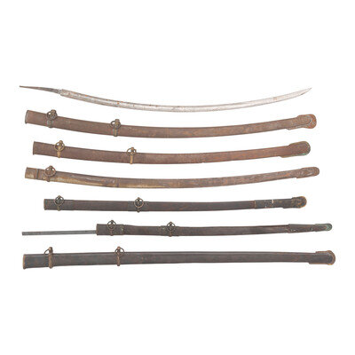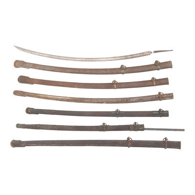 31.75" long blade with 5.4" long tang, unsigned with fullered blade 0.75" in width. Lacks visible maker marks, and the tang appears to have split and been rewelded and polished at some point. Also included are six scabbards, four in steel and two leather with brass rings, throats, and drags, some nickel plating visible on one scabbard. All items show signs of rust, and consist of both original parts and repaired or reproduction components, particularly in the rings and throats.