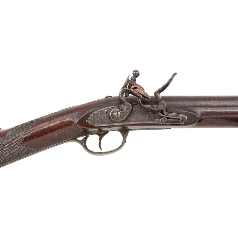 .69 caliber. 40" pinned round barrel with baluster turned rings at the breech. NSN. Bright finish, brass furniture, walnut stock with checkered wrist. Single shot smoothbore muzzleloading flintlock militia fowler with socket bayonet lug located on top of the barrel, 1" from the muzzle, no sights, no sling swivels and with a period button head iron ramrod in the channel under the barrel. Lightly engraved commercial flint lock is marked J COOPER and appears to remain in original flint, although the lock could not be removed for inspection due the inability to remove the front lock screw. Lock is nominally 4.5" in length with an externally bridled rounded and fenced waterproof pan, roller frizzen and flat swan neck cock. Endoscopic examination reveals that the barrel remains in original flint. The entry pipe and one of the ramrod thimbles are missing, as is the nose cap of the stock.