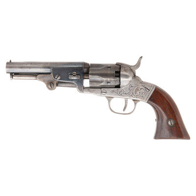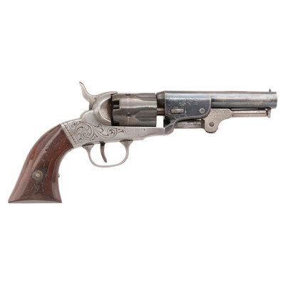.31 caliber. 4" round barrel. SN: 181. Blued finish, color casehardened hammer and loading lever, smooth two-piece walnut grips. Single action percussion pocket revolver with lightly engraved frame, ball detent retained toggle link loading lever, five-chambered fluted cylinder, hammer nose notch rear sight and brass cone front sight. Barrel with one-line BACON MF'G CO NORWICH, CONN address. Matching numbers throughout. It is estimated that about 3,000 of these competitors with the Colt 1849 Pocket Revolver were produced during the early-to-mid-1860s. {ANTIQUE}