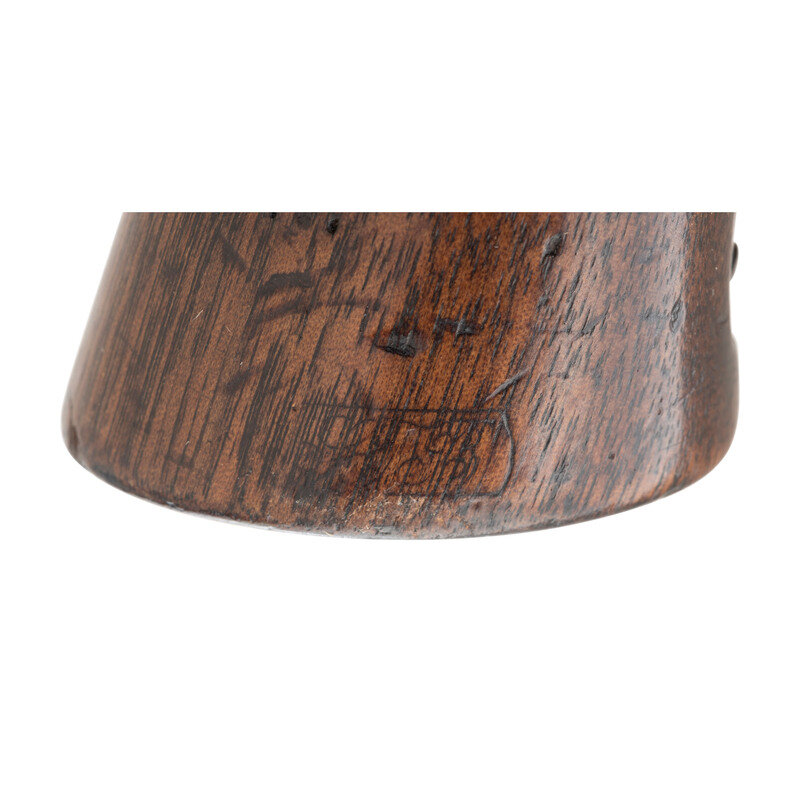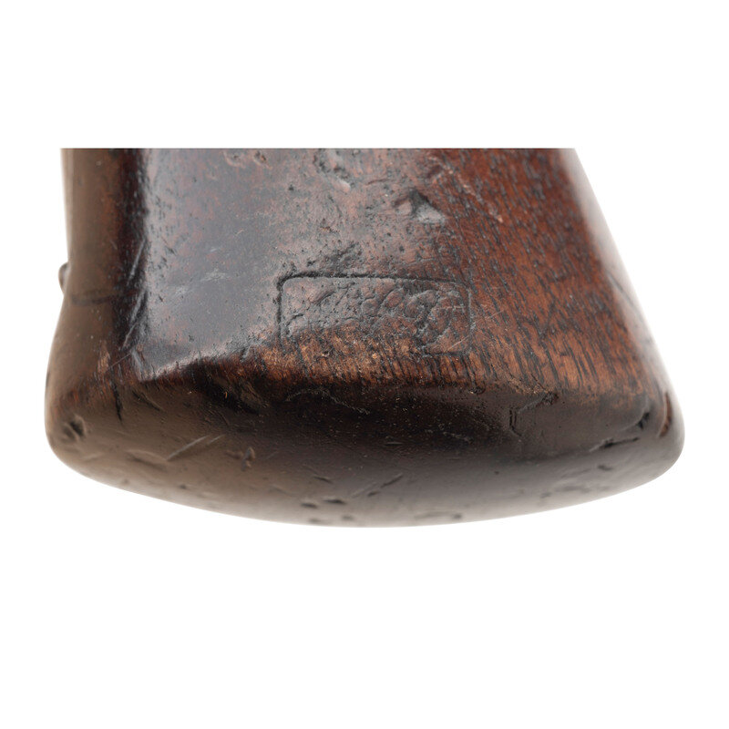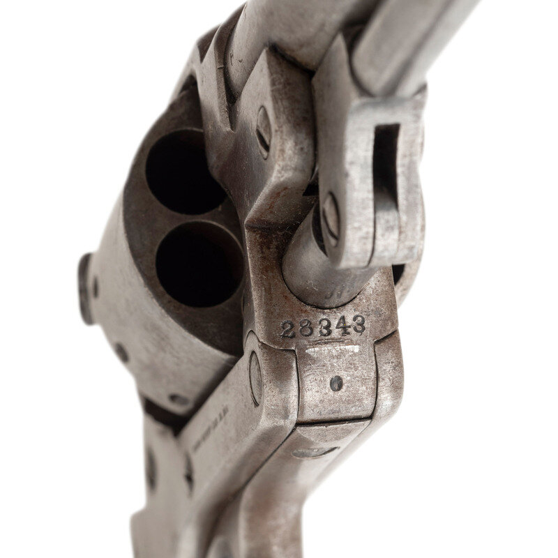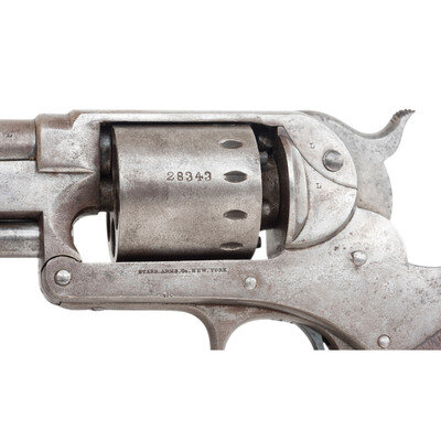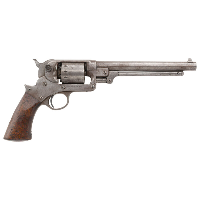 .44 caliber. 8" round barrel. SN: 28343. No finish, one piece walnut grip. Single action percussion revolver with toggle link loading leaver, six-chambered unfluted cylinder, hammer nose notch rear sight and dovetailed blade front sight. Standard frame markings, weak sub-inspection marks in metal, traces of weak cartouches on the grip. {ANTIQUE}