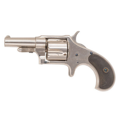 .38 Rimfire. 2.5" barrel length. SN: 7515. Nickel plated finish with blued screws and mounting checkered hardrubber birdshead grips. Single action spur trigger revolver with five-shot cylinder and featuring half moon front blade and fixed rear notch sights. Serial numbers match on interior frame. Barrel address reads in a single line E. REMINGTON & SONS, ILION, N.Y. {ANTIQUE}