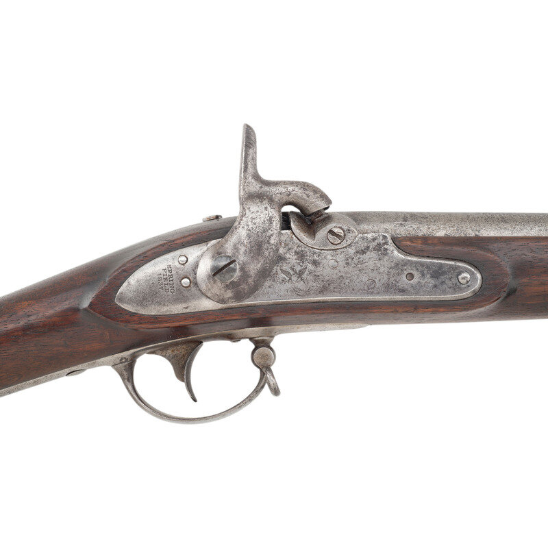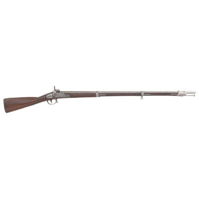 .69 caliber. 42" barrel secured by three flat, spring retained bands. NSN. Bright finish, iron furniture, walnut stock. Single shot muzzleloading percussion conversion of a US military musket with sling swivels, brass front sight blade and button head ramrod. Lock marked with a {Spread-Winged Eagle}/US forward of the hammer and in three vertical lines at the tail SPRING/FIELD/1837. Two weak script cartouches are present on the counterpane, the ET of Elisha Toby and the EB of Elizeur Bates. Alteration to percussion via Henry Leman's patent breech system with clean out screw in the bolster. {ANTIQUE}
