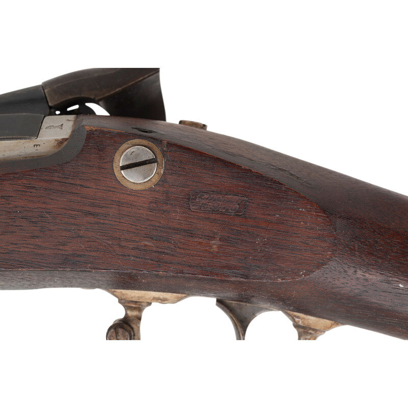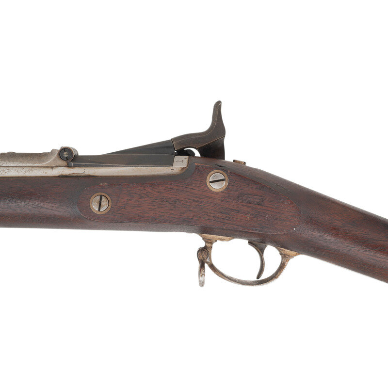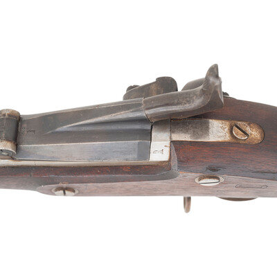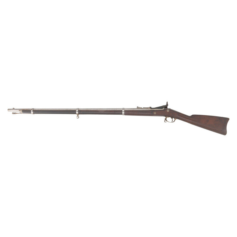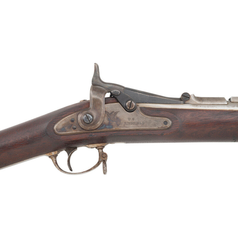 .50-70. 36.625" barrel secured by three solid convex spring-retained barrel bands. NSN. Bright finish, color casehardened lock casehardened beech block, iron furniture, full-length walnut stock. Single shot breechloading "trapdoor" alteration of a Civil War era rifle musket with the M1866 leaf rear sight, Barleycorn combination front sight blade and socket bayonet lug, sling swivels and a jag head cleaning and clearing rod. Lock marked with a {Spread-Winged Eagle}/U.S. forward of the hammer, dated 1864 at the tail. Breech block with 1866/{Eagle Head} marking and another {Eagle Head} at the left rear of the breech. Counterpane with a crisp script HSH cartouche, the mark of Springfield Arsenal inspector Henry S. Hill. A really fine example of a US Model 1866 Infantry Rifle. {ANTIQUE}