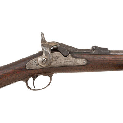 .45-70. 20" barrel. SN: 535442 (mfg. ca. 1892). Blued and color casehardened finish, iron furniture, walnut stock. Single shot breechloading composite carbine made from parts. Late production M1888 serial number, low arch breech with no legible markings. Lock is a M1864 Springfield lock dated 1864. Rear sight of M1873 pattern with incorrect mounting screws and graduated to 1,100 yards on the ladder. Solid buttplate with holes cut for cleaning rods concealed underneath. Front sight an incorrect ramped sight added to the barrel. No stacking swivel on single barrel band, smooth trigger, two-piece triggerguard, two click tumbler, saddle bar somewhat ill-fitting and may have been added to a shortened rifle stock. An interesting composite probably assembled by Bannerman and later used as a hunting rifle if the front sight is any indication.