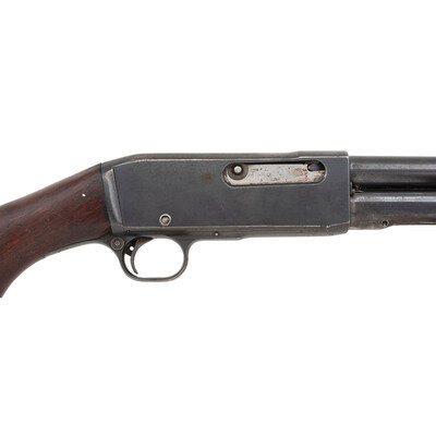 .30 Remington. 22" barrel length. SN: 82640. Blued metal finish with polished bolt mounting walnut semi-pistol grip stock with corncob forend and mounting adjustable semi-buckhorn rear notch and front blade sights. Slide action repeating rifle fed by a tube magazine. Standard make and model markings including three-line address and patent mark to upper barrel. Item is missing the buttplate. Paint residue to muzzle and left receiver. {C&R}