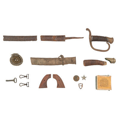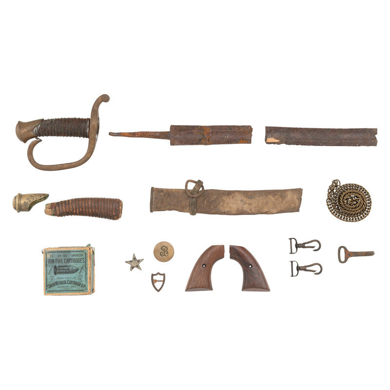 Lot contains two lengths of dug sword blades of 7.5" and 9.5" in length, the longer with tang, brass sword hanging chain measuring 21.5", steel scabbard throat 10" in length, leather and braided wire wrapped sword handle, cast brass pommel cap with olive branch patterns, two hanging chain hooks, hilt for a US Model 1840 Light Artillery Saber, brass hook 2.5" long, tin star stamped TEXAS, dug shield buckle, brass button with initial B, empty cardboard box for .56-56 Spencer cartridges by the UNION METALLIC CARTRIDGE CO., and a pair of walnut two-piece Single Action Army grips, likely modern manufacture.