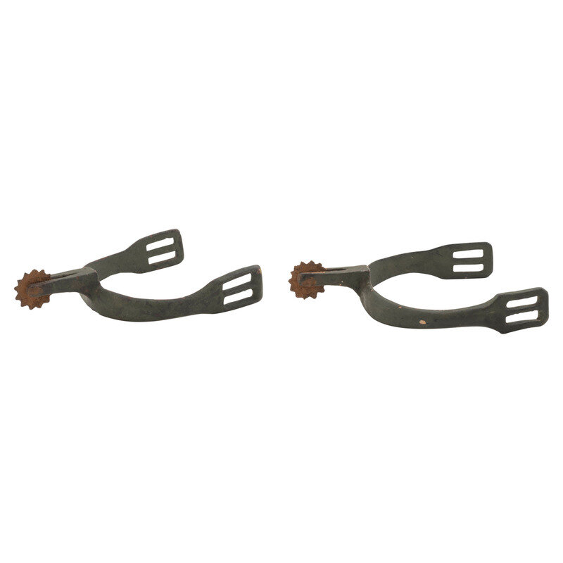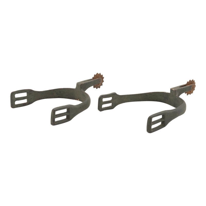 Pair of cast brass spurs that were used in Bill Beard's Lt. Box display. They are unmarked and have an applied "patina" that is paint like, suggesting the brass underneath has repairs. Probably a dug pair that were later restored. Crudely cut rusted iron rowels appear to be modern replacements that have been aged chemically. Spurs are not identical. One measures nominally 4.25" in length, exclusive of the rowel and slightly less than 3" wide, while the other measures 4.5" in length and slightly more than 3" wide.