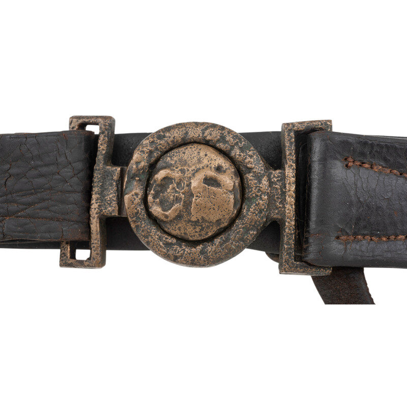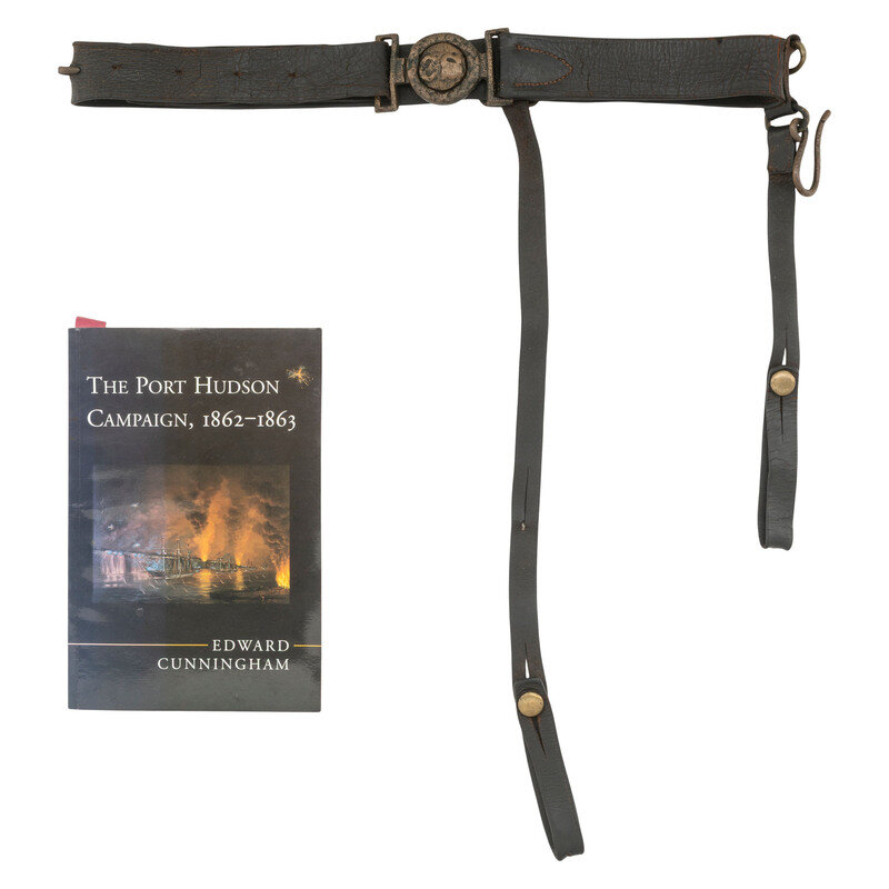 Belt is currently adjusted for a nominally 34"-35" waist with an overall length of about 38". Leather is 1.5" wide. Somewhat crudely sewn with saber hanger attachments and a brass adjustment hook. Crudely cast Mullianx (First Edition) #051 pattern two-piece CS plate. Belt is in a display case with a book about Port Hudson and some reference information about the plate. This pattern of plate was removed from subsequent editions of the Mullinax book.