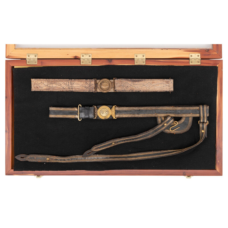Display Case with Two 19th Century Military Belts with High Quality Replica CS Belt Plates