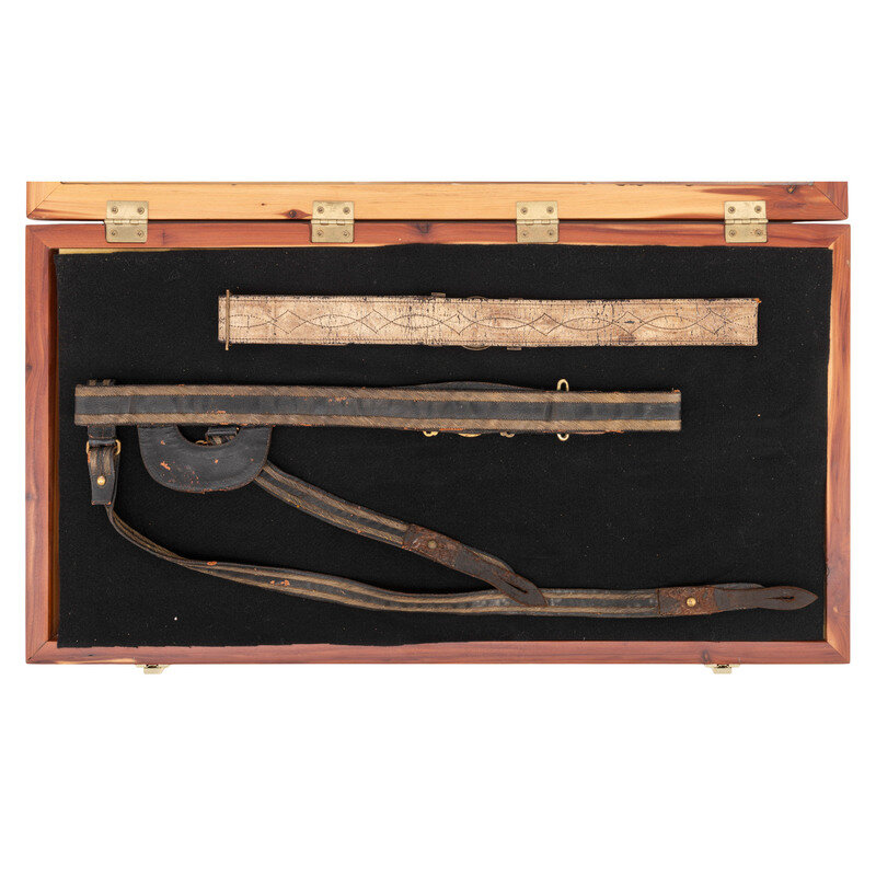 1) Painted leather folded and sewn officer's belt with decorative stitching and a very high quality reproduction South Carolina Palmetto Tree two-piece cast brass buckle. Belt is currently adjusted for a nominally 38"-39" waist with an overall length of about 49". Belt is 1.6" wide.