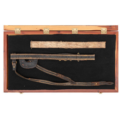 2) Folded and sewn bullion decorated officer's sword belt with a very high quality gilt cast brass reproduction Old English "CS" two piece buckle. Belt is currently adjusted for a nominally 43"-44" waist. Overall length about 45" with a width of 1.4". Belt with some restoration with the leather at the tongue end a modern restoration. Belt includes two leather and gold bullion sword hangers with leather tabs and a brass scabbard support hook, along with the extra leather backing pieces to protect the uniform under the buckle and at the sword hangers.