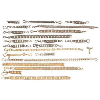 Lot of ten sword hanging chains in assorted materials including brass and steel. Patterns include etched and cast designs with floral and geometric motifs. Comes with broken dug spur with part of the neck intact and the rowel broken free.