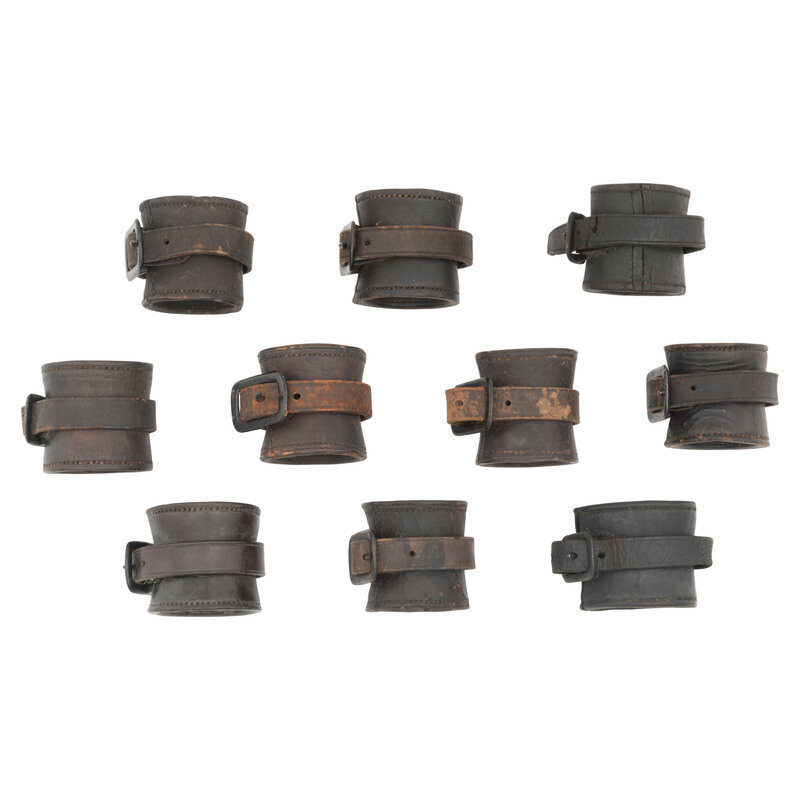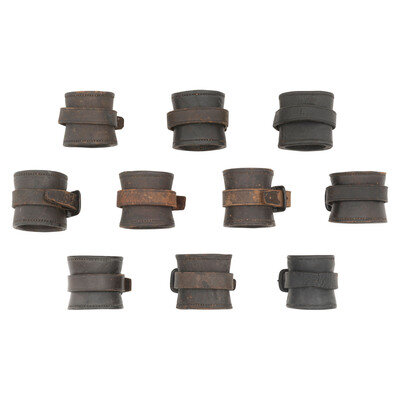 Group of 10 Civil War era carbine sockets for carbine carry on horseback, attached to the saddle and tack. All are of leather construction with riveted seam closures and have japanned iron buckles. Eight appear to be unmarked, one is METZGER marked and one has an illegible marking.