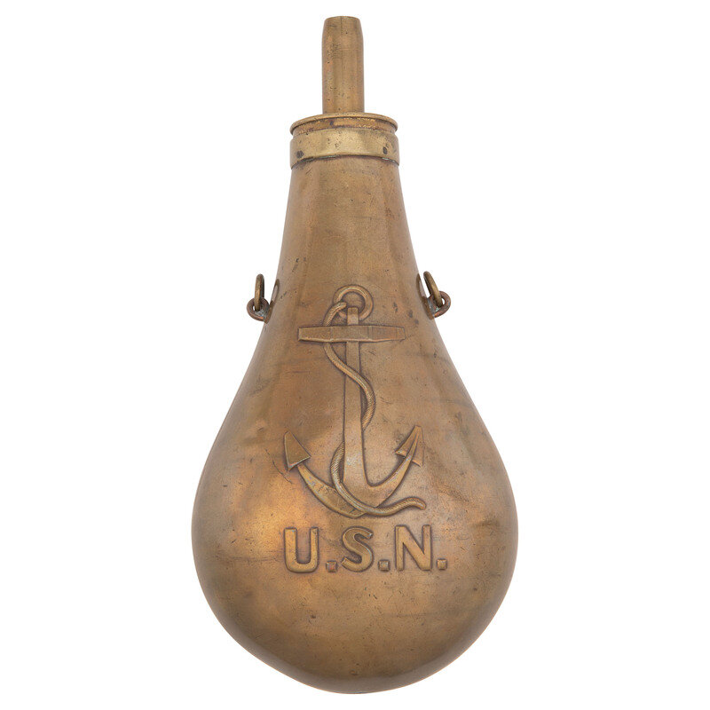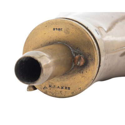 Nominally 9.5" in overall length, including the spout, with a nominally 8"x5" two piece stamped brass body, about 2.5" thick, embossed with a {Fouled Anchor} over U.S.N. Marked on top of charger lid, N.P. AMES and dated 1843. A weak script WAT inspection mark, that of Ordnance Officer William Anderson Thornton, and a P are stamped on the top as well. Another P appears on the side of the charger lid. A pair of sling suspension rings are attached to the body of the flask. The flask is designed to hold about 14 ounces of powder and the fixed spout throws a nominally 65 grain powder charge. A solid example of the first contract for USN powder flasks and a perfect accessory for a Jenks Naval Carbine or even an Ames Boxlock Navy Pistol.