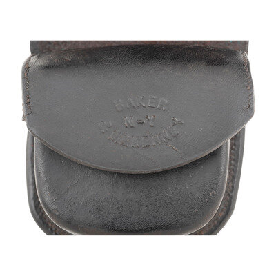 Pattern of March 1864 cartridge box measures nominally 7.125" wide by 5.875" tall by 1.8" thick, not including the front flap. Both the belt loops and closure tab are reinforced with copper rivets. The box is maker marked by Baker & McKinney on the inner flap. It includes the tin magazines on the interior and has a SNY cartridge box plate on its face. Additionally a Baker & McKinney marked cap pouch is included. The cap pouch does not retain any wool or the pick and is filled with cotton balls.