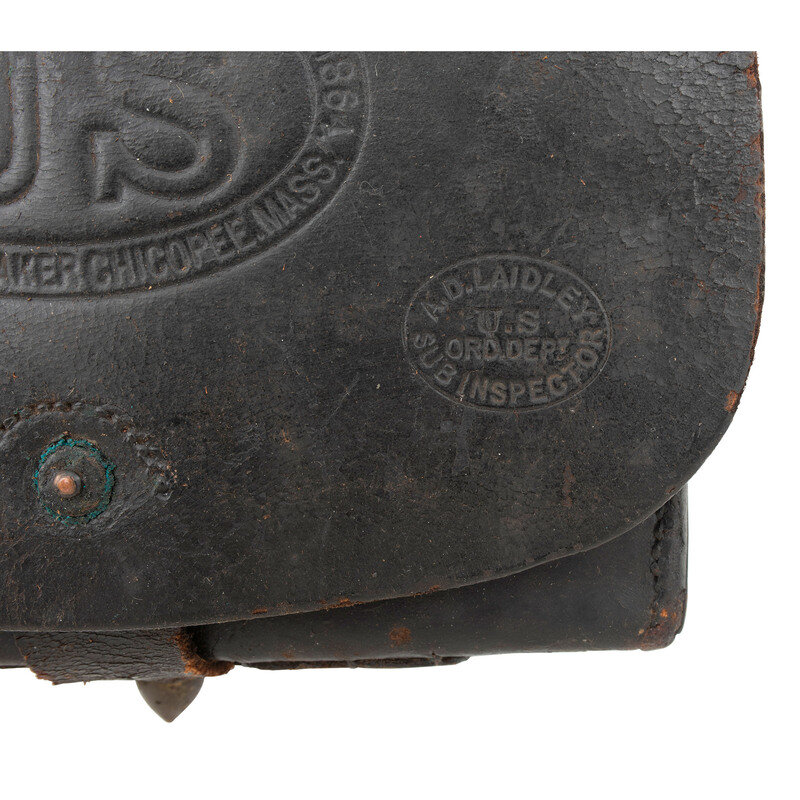 2) Mann's Pattern Cartridge Box with suspension strap system, including the Mann patent tin magazine on the interior. Well marked on the front flap with Mann patent information, US and Gaylord maker's mark as well as inspector's cartouche. Measures nominally 6.5"x5"x1.75", not including the outer flap.