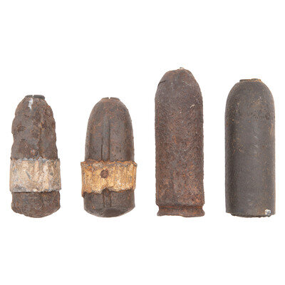 4) Dug sectioned 10 Pound Parrot Case Shot. Nominally 8" tall by 2.85" in diameter.