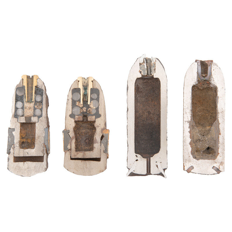 2) Dug sectioned 3" Hotchkiss Artillery Shell. Nominally 7" tall by 2.95" in diameter. Filled with medium and balls.