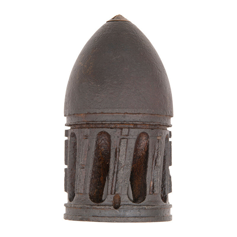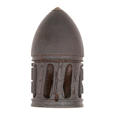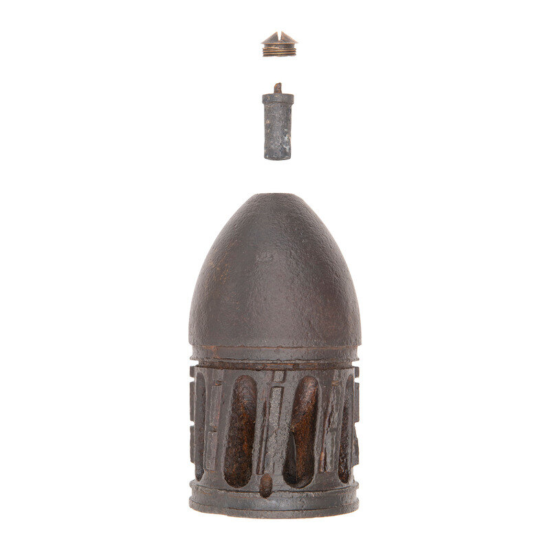 Nominally 7.25" tall and 3.7" in diameter. With brass anvil cap in nose and zinc percussion plunger in place. Disarmed and empty.