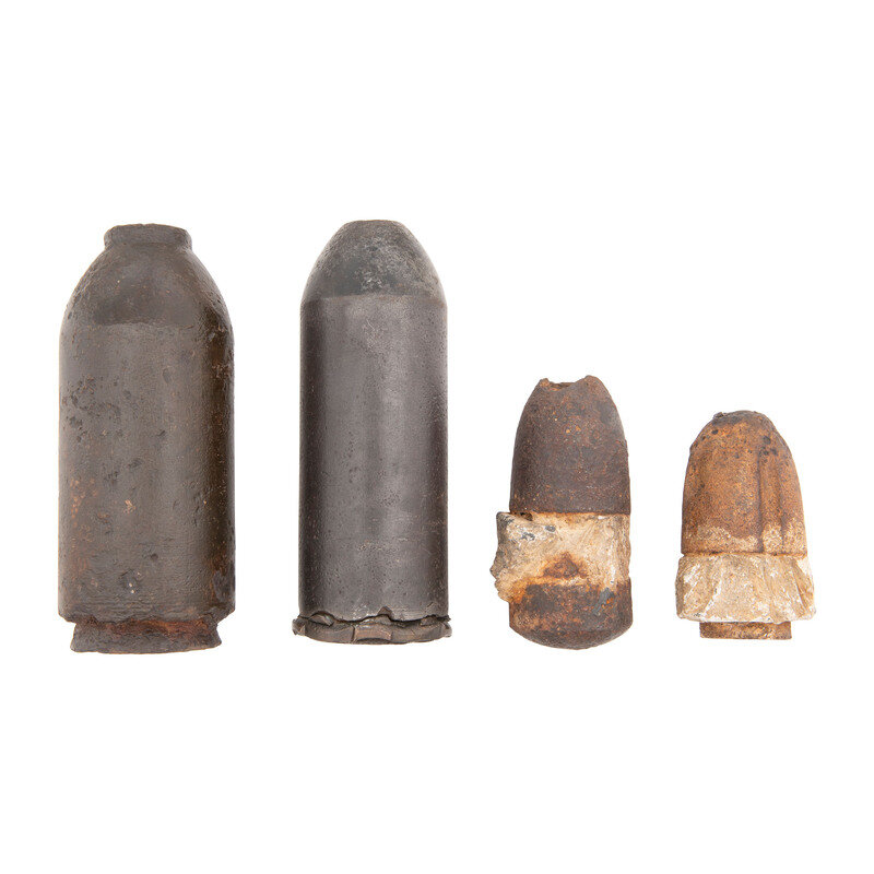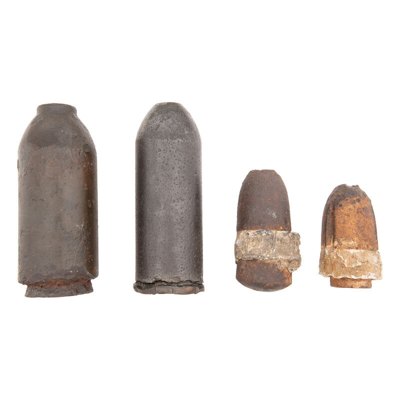 Four Excavated Civil War Artillery Shells: #30 Parrott Bolt, #20 Parrott Shell and Two Hotchkiss