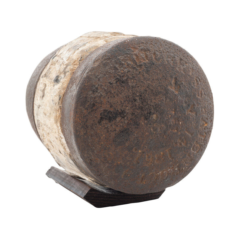 1) Dug 3.8" Hotchkiss Bolt for the 14 Pound James Gun. Nominally 7" tall by 3.7" in diameter. Weak patent markings in base. Retains much of the lead sabot.