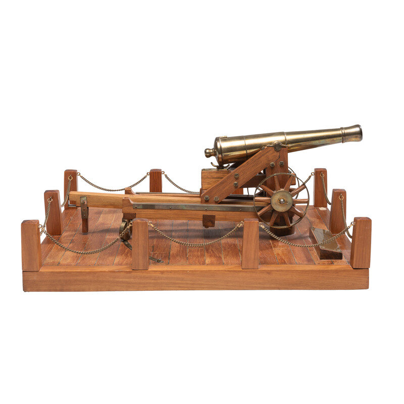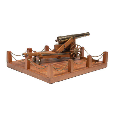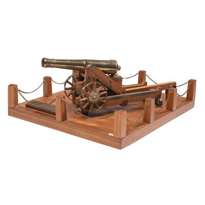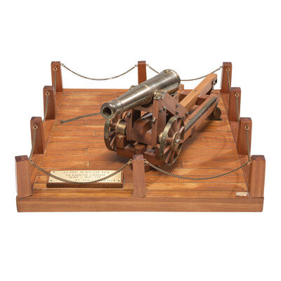 Replica 32 Pound Seacoast Gun on transversing barbette carriage made by the late, well known replica cannon maker Ron Hagreaves of Canada. The cannon and carriage are nominally 15" long, 6" tall and 4" wide, and are mounted on a wooden base with traversing track on it, which is nominally 14"x16". The replica is built at .75" to 1' scale or 1/16th scale. Cannon traverses and moves as it should. A brass plaque identifying the gun and maker is attached to the base.
