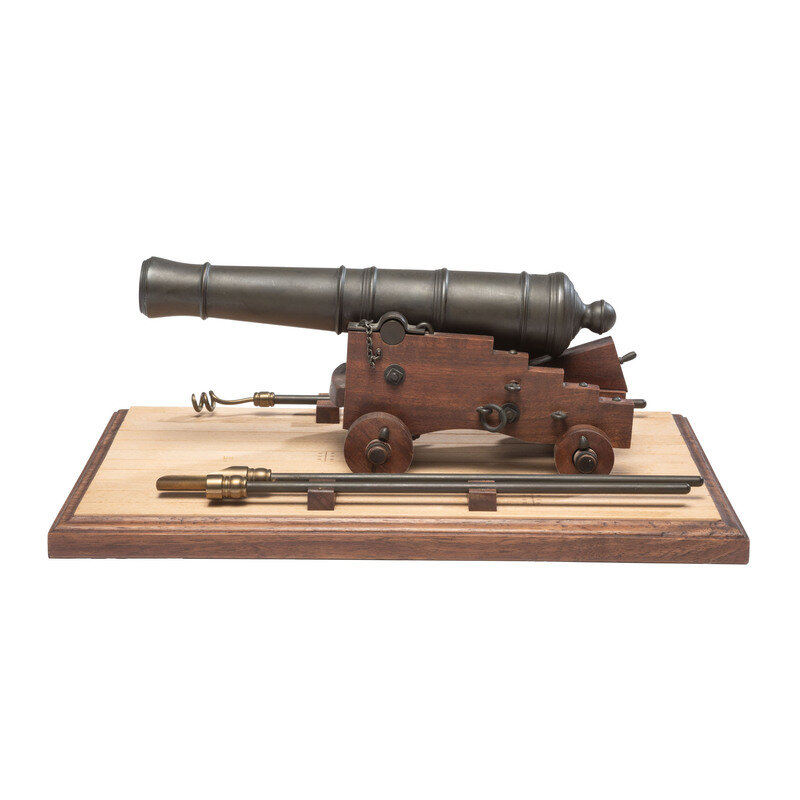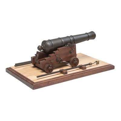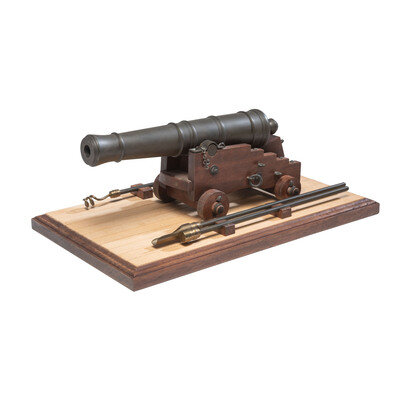A scale replica of what appears to be a 24 or 32 pound early 19th century English naval cannon on a naval truck. Cannon barrel measures nominally 11", including the cascabel and about 12" including the carriage, with a height and width of about 5". The cannon is accompanied by a 15"x9" display base with a set of artillery implements. A nice cannon display for your office or gun room, particularly one with a Napoleonic Era nautical focus.