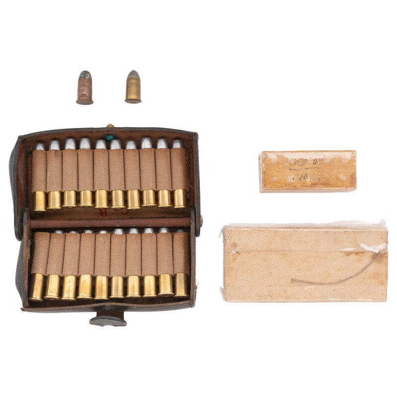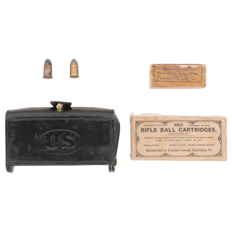 2) An unopened box of 10 Frankford Arsenal .50 caliber Remington Rolling Block pistol cartridges, dated May 1873.