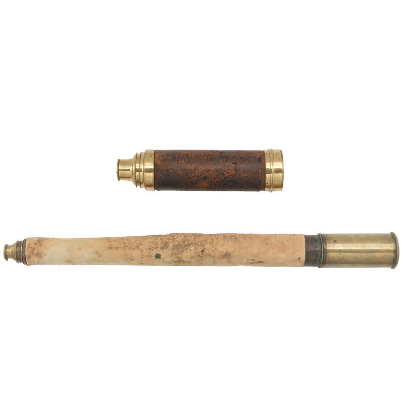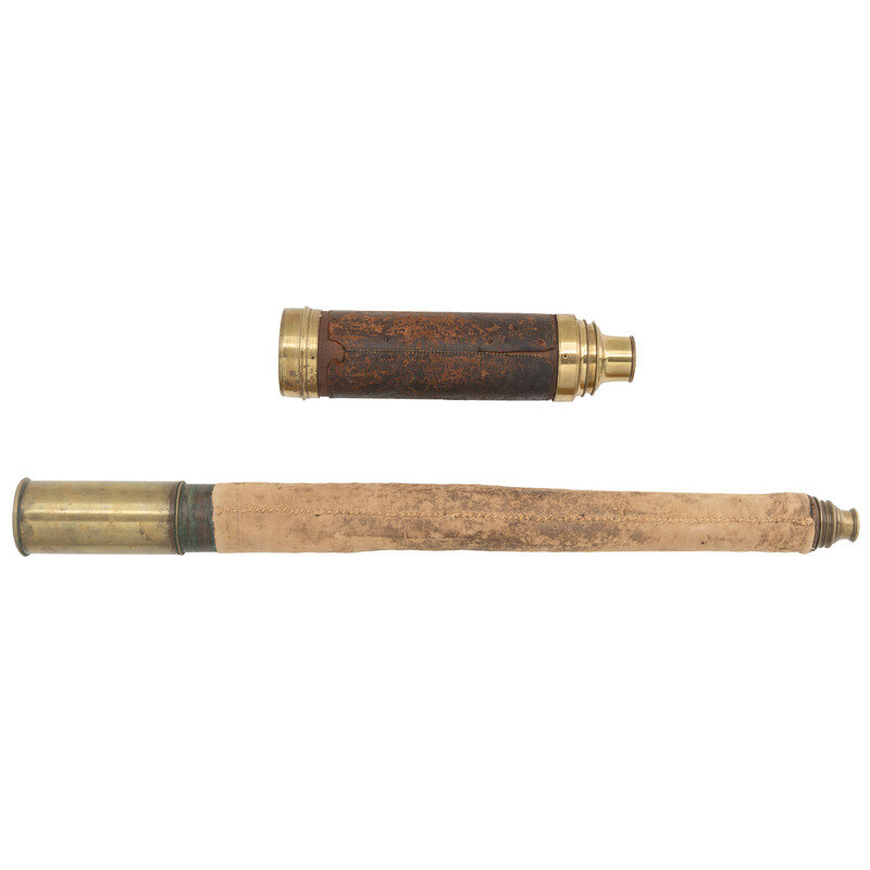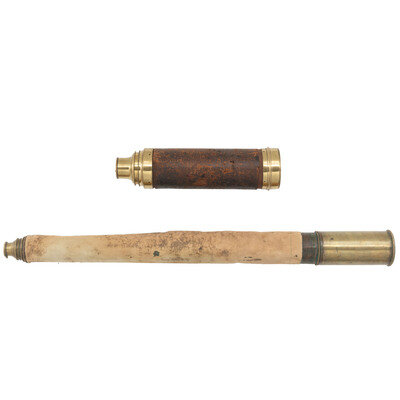 1.) 18" long at full extension. 3.125" diameter. Brass and wood spyglass with leather wrappedgrip engraved with the maker markings E. & G.W. Blunt/New York./Night Glass. in addition to U. S. Navy property marking. Objective lens is cracked in two directions.