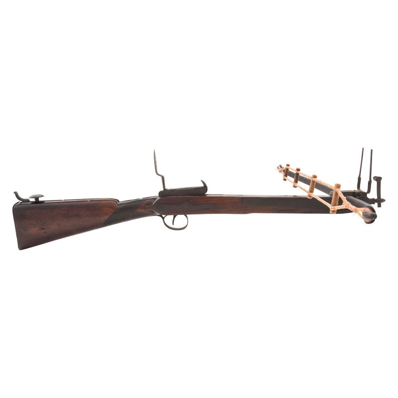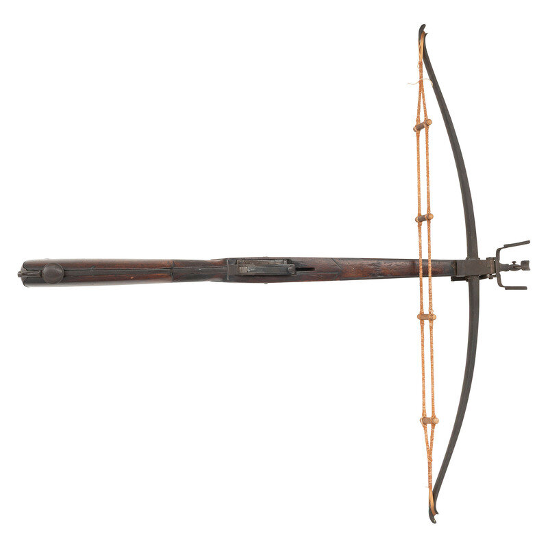 30" limb width. 31.5" overall length. Bright finish to metal that has developed brown patina across surfaces mounting a walnut straight wrist stock. Lever cocking bullet crossbow with folding front and rear sights with cocking lever hidden in comb of stock. Rear sight features four aperatures paired with two limb front sight. Features string with wooden dowel spacers but is missing loading apparatus. Bordered checkering to wrist with engraving on top of latch. Bowstring is replaced.