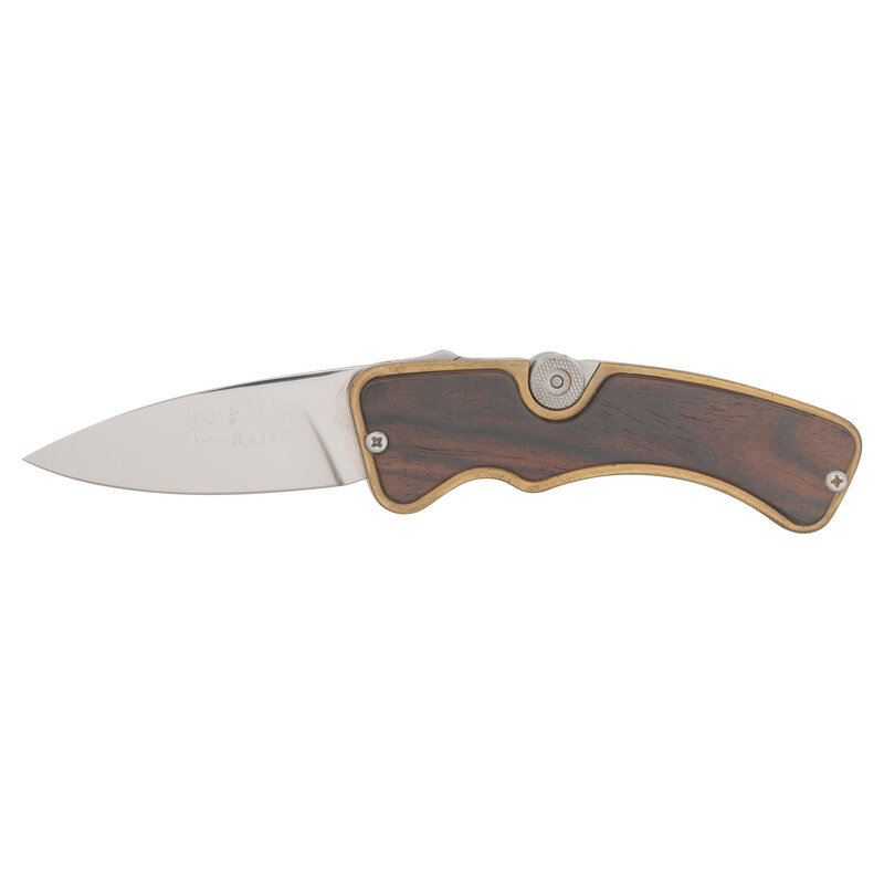 3" blade length. 7.5" overall with blade extended. Single edge drop point folding knife with brass hilt mounting Cocobolo grip scales and featuring a unique locking back inspired by the toggle action of the Luger pistol. Left ricasso struck Luger/# 67 of 100/Knife beside {Pawprint} maker marking. The components of the toggle are all marked 67, matching the number of the knife.