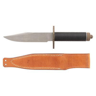 A full time knifemaker from 1971, James "Jimmy" Lile continued to produce handmade knives until his death in 1991. The company now bearing his name continues to offer a wide variety of knives following Lile's original patterns. The best known of these being the enormous clip-point serrated bowie knives that Lile produced for the movie "Rambo: First Blood", starring Sylvester Stallone. This lot represents a more sober take on the hollow handle concept and offers a thoroughly practical survival knife in that style.