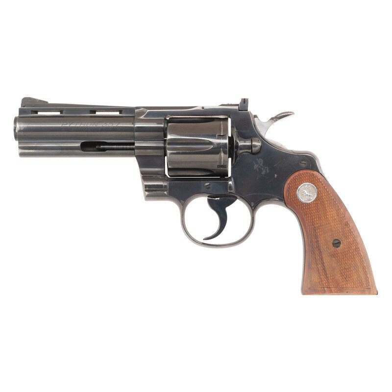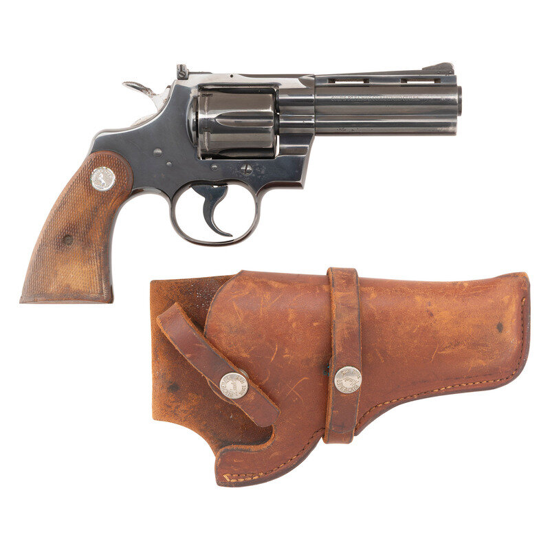.357 Magnum. 4" barrel length. SN: 12502. Blued metal finish with polished hammer flanks mounting checkered walnut Colt medallion grips. Double action six-shot hand ejector revolver featuring a full length vented barrel rib and underlug, and standard adjustable rear notch and pinned front ramp sights. Item shows standard make and model markings including {Rampant Colt} logo to sideplate. Item is missing ejector rod pin head. Comes with a BUCHEIMER/Made/SINCE/1884 leather holster. {C&R}