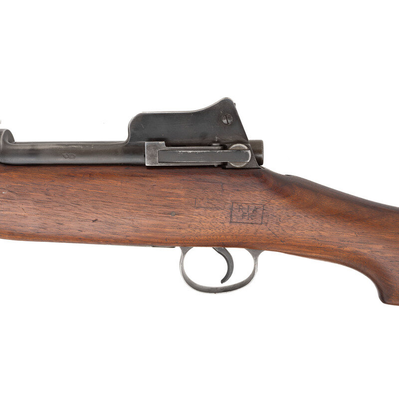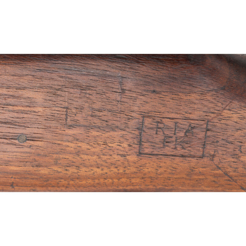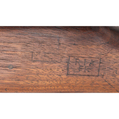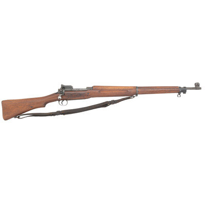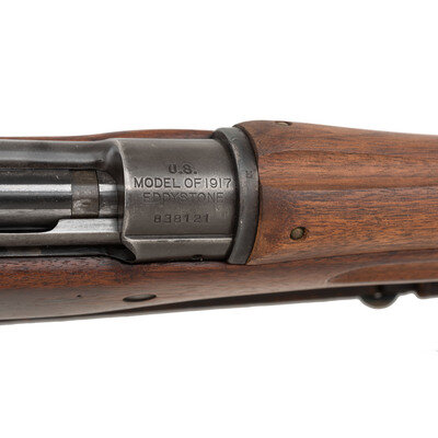 .30-06. 26" barrel length. SN: 838121. Blued metal finish with walnut semi-pistol grip stock, full length upper handguard, and mounting rear aperture ladder and front blade sights with protectors. Bolt-action rifle fed by internal magazine featuring a cock-on-close action. Receiver struck with the maker markings U.S/MODEL OF 1917/EDDYSTONE with the barrel marked E/{Ordnance Bomb}/6-18. Left receiver is struck with second {Ordnance Bomb} marking. Left stock struck with illegible boxed cartouche followed by boxed RIA/FK. Comes with leather pattern of 1907 sling. {C&R}