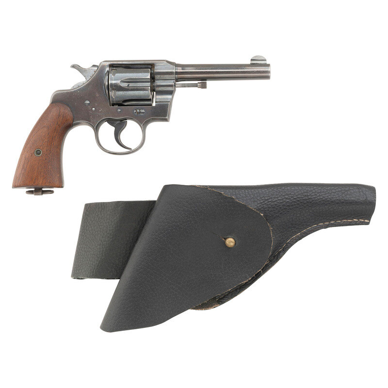 .38 Special. 4.5" barrel length. SN: 385846. Blued metal finish with polished hammer flanks mounting smooth walnut grips and featuring a lanyard loop to the butt. Double action six-shot hand ejector revolver with topstrap notch and half-moon front blade sights. Left barrel struck COLT ARMY/SPECIAL 38 with top of the barrel showing two-line address and patent marks with the final patent dated 1905. Sideplate shows the {Rampant Colt} logo behind the latch. Comes with a black leather hand stitched flap holster. {C&R}