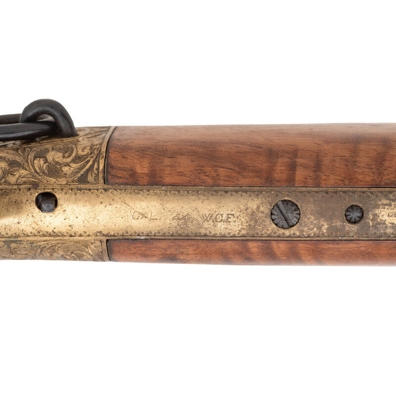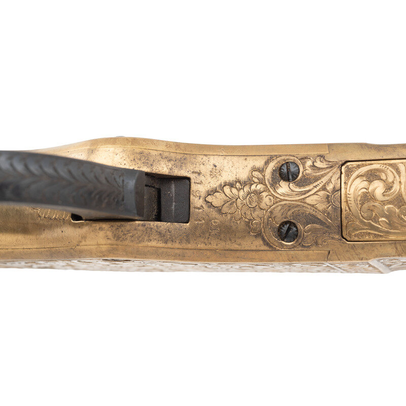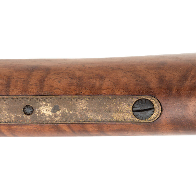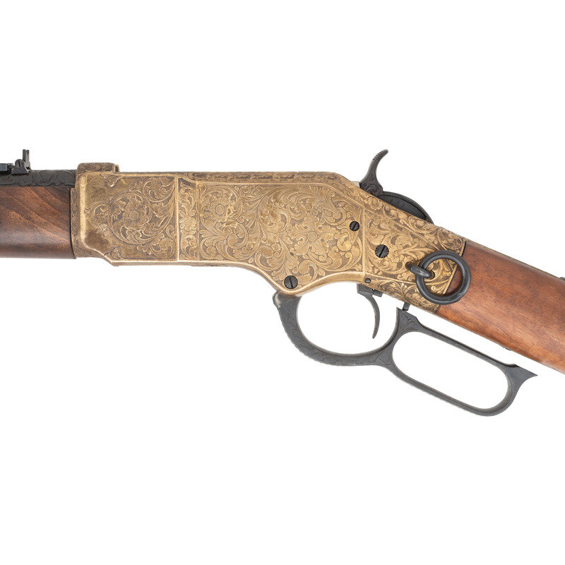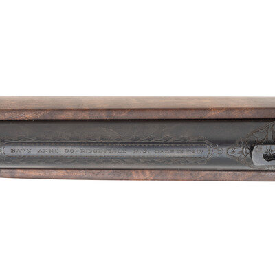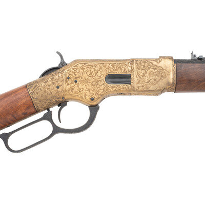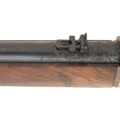 .44-40. 19" barrel length. SN: 11911. Blued metal finish with gilt gunmetal receiver and butt mounting walnut straight wrist stock and forend, and folding ladder rear notch and front blade sights. Lever action repeating rifle fed by a tube magazine charged from the rear. Item shows standard Italian firing proofs and Uberti maker markings on the lower tang. Barrel address reads NAVY ARMS CO. RIDGEFIELD N.J. MADE IN ITALY within an engraved banner. The complete frame, barrel bands, lever, hammer and rear barrel are all richly embellished with deep floral scrollwork over a beaded ground. Buttplate is solid and without trapdoor, and features matching engraving. No visible engraver signature. {C&R}
