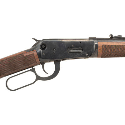 .410 Gauge. 24" barrel length. SN: SG04133. 2.5" chamber length. Cylinder choke. Blued metal finish mounting machine checkered walnut straight wrist stock with rubber recoil pad and half length handguard. Lever action repeating shotgun fed by a full length tube magazine and mounting adjustable semi-buckhorn rear notch and green fiber optic front sights. Standard make and model markings. Receiver fits the angle ejection system, crossbolt safety, and is drilled and tapped from factory for optics mounting. {MODERN}