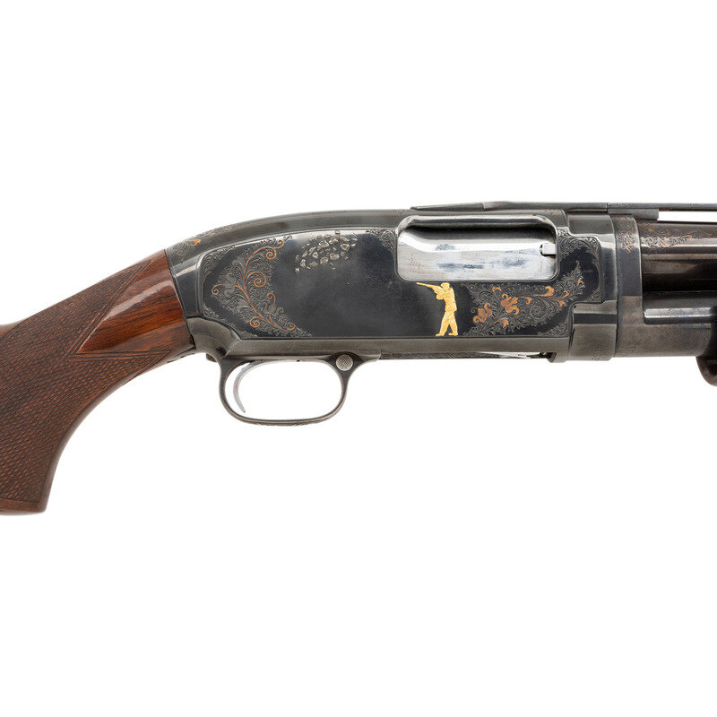12 Gauge. 27" barrel length (with compensator). SN: 1687190. 2.75" chamber length. Modified Choke. Blued metal finish with polished bolt and mounting polished walnut semi-pistol grip stock with bordered checkering to wrist and forend. Slide-action repeating shotgun embellished with spiral scroll engraving inlaid with silver and gold. Right receiver features a gold skeet shooter having just struck a silver clay pigeon. Left receiver features a silver trap shooting range with gopper inlaid shotgunners engaging a pigeon. Rear receiver additionally decorated with a gold S initial within floral silver inlaid floral scroll. Item features a non-factory full length vented barrel rib that has been mated with the Cutts compensator. Sights consist of a rear silver bead on the rib, and a white bead to compensator. Buttplate is checkered wood. {MODERN}