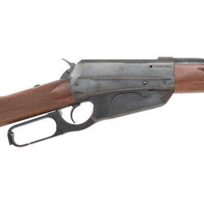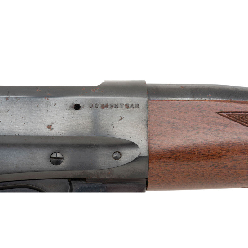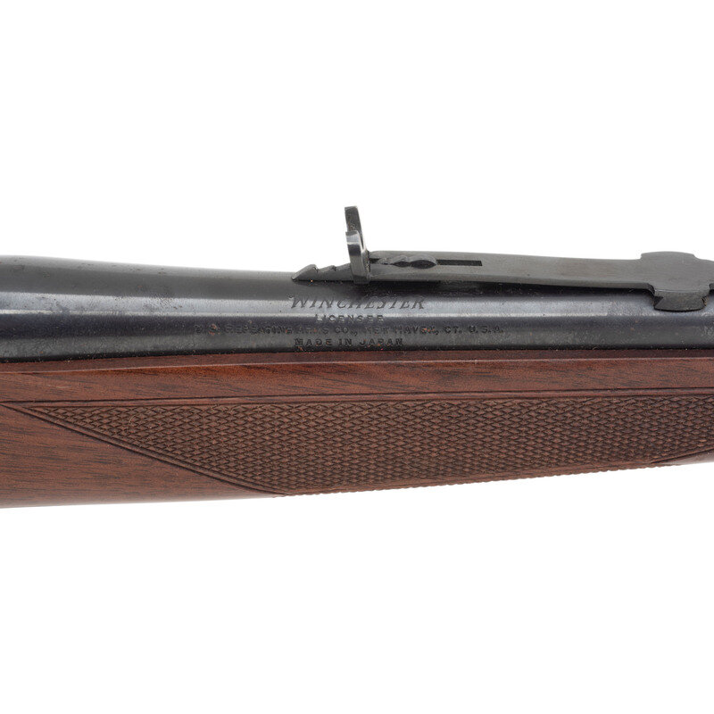 .30-06. 24" barrel length. SN: 00249NTSAR. Blued metal finish mounting walnut straight wrist stock and schnabel forend with machine cut checkering to wrist and forend. Lever action repeating rifle fed by an internal box magazine. Sights consist of adjustable buckhorn rear notch and brass front bead. Item mounts a tang safety. Standard make and model markings including MADE IN JAPAN to right barrel. {MODERN}
