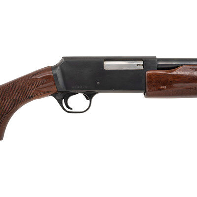 .22 Magnum. 20.25" barrel length. SN: 33598RP176. Blued metal finish with polished bolt mounting polished walnut semi-pistol grip stock with checkered forend and wrist, and mounting folding rear notch and front brass bead sights. Slide action repeating shotgun fed by a frontally charged magazine tube. Standard make and model markings. Top of receiver is dovetail cut for optics mounting. {MODERN}