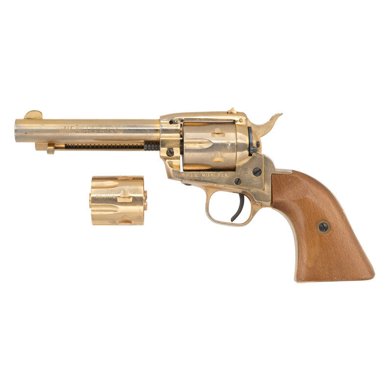 .22lr. 4.75" barrel length. SN: TC34535. Gold plated metal finish overall with wood grip panels mounting rear peep sight and bladed front sight and hammer block safety. Single action loading gate revolver with hammer block safety and six shot cylinder. Item includes spare cylinder chambered in .22 Magnum. {MODERN}