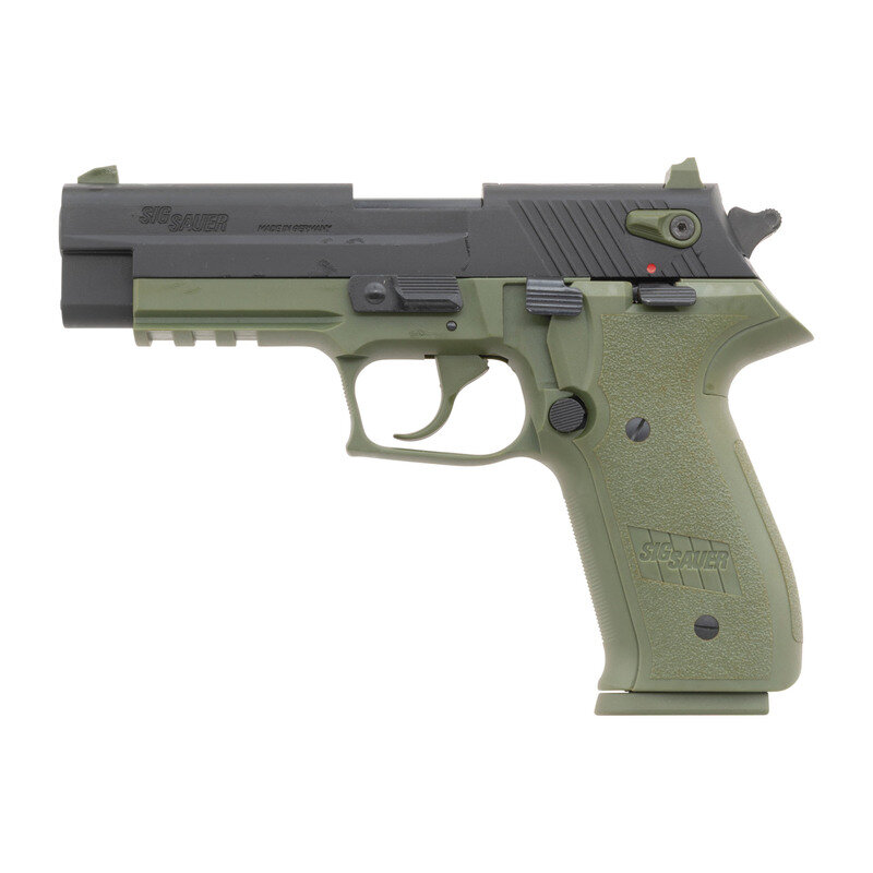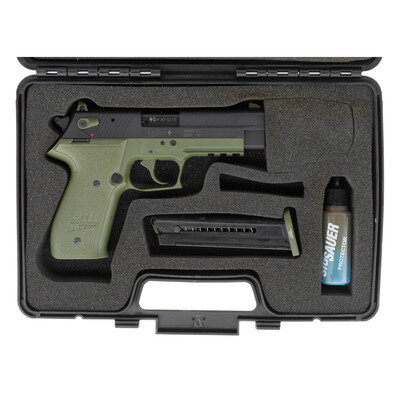 .22 LR. 4" barrel length. SN: A019015. Parkerized metal finish with green synthetic frame and grip panels mounting fixed triple yellow dot sights. Simple blowback operated DA/SA autoloading pistol fed by detachable single stack magazines. Item shows standard make and model marks, and German firing proofs to major parts. Comes with its original hard case with factory test target, owner's manual, and cable lock in package. {MODERN}