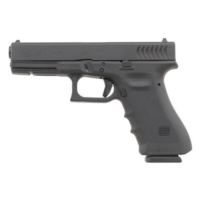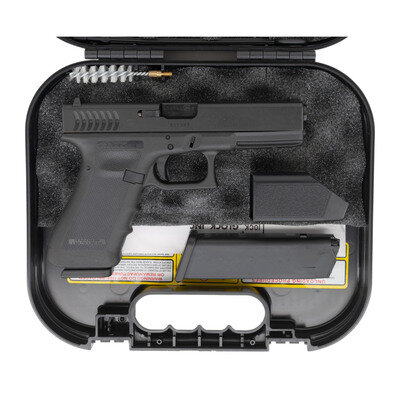 .40 S&W. 4.49" barrel length. SN: NBE997. Black Tenifer "frying pan" finish to metal parts with black synthetic frame featuring accessory rail, RTF2 texturing to grips, backstrap, and finger grooves, and Crescent serrations. Item mounts standard Glock pattern sights and shows Glock Austria manufacturer markings. Comes in original black synthetic hard case with owner's manual, factory test casing in package, cable lock, nylon bore brush, magazine loading tool, and a total of two magazines. {MODERN}