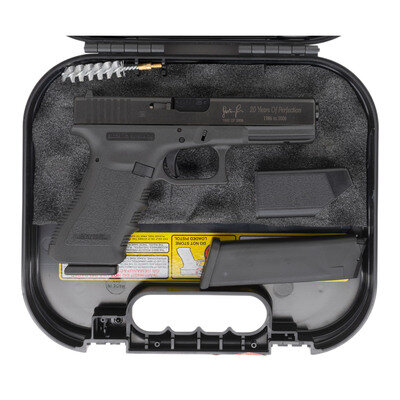 9mm Para. 4.49" barrel length. SN: KHC556. Black Gen 3 Tenifer "frying pan" finish with black synthetic frame featuring accessory rail and finger grooves. Short recoil-operated striker-action autoloading pistol fed by detachable double stack magazines, and commemorating the 20th Anniversary of the Glock 17. Item mounts standard Glock pattern sights, and shows the Glock Austria manufacturer marks. Right slide features the signature of Gaston Glock followed by 20 Years Of Perfection/1986 to 2006, along with the issue number 1557 OF 2006. Item comes in its original black synthetic hard case with owner's manual, factory test casing, nylon bore brush, magazine loading tool, and a total of two magazines. {MODERN}
